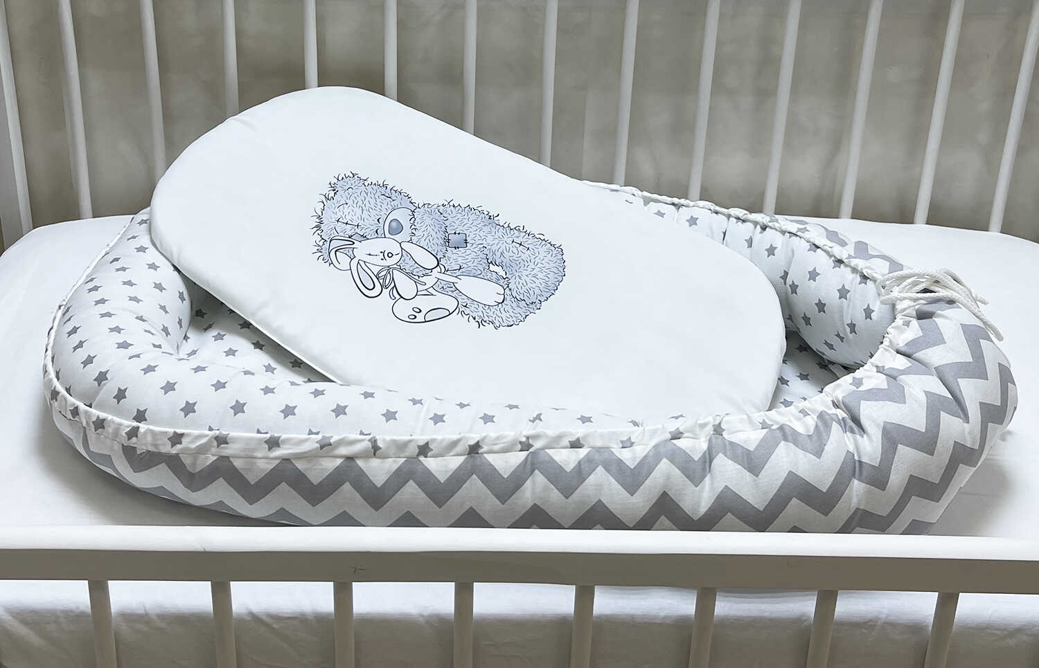 Ткань: хлопок 100%. Стандартная комплектация: кокон + матрасик с печатью (микрофибра). Наполн..